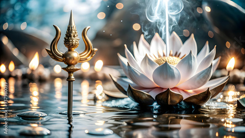 Glowing Abstract Lotus and Trident concept as A serene glowing abstract digital art featuring a lotus and trident symbolizing purity and divine power in the context of Dussehra. Perfect for spiritual