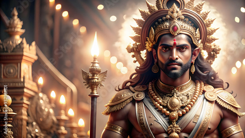 Glowing Abstract Rama with Justice Text concept as A bold glowing abstract digital art featuring Rama with a radiant aura symbolizing justice and righteousness in the Dussehra story. Perfect for event