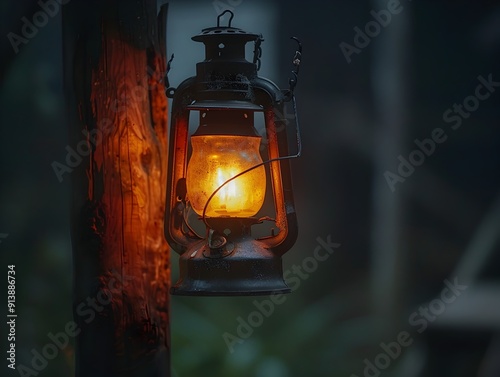 Glowing Antique Oil Lantern Hanging on Wooden Post in Rustic Outdoor Setting with Copy Space