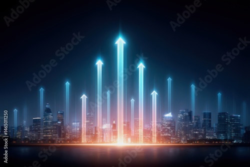 Glowing arrows rise above a modern city skyline at night, symbolizing growth, innovation, and upward progress.