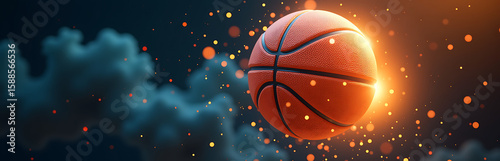 glowing basketball suspended amidst swarm swirling blue gold particles illuminated warm golden light