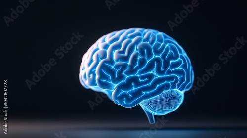Glowing blue AI brain isolated on a dark gradient background with circuit-like patterns, radiating light from neural connections