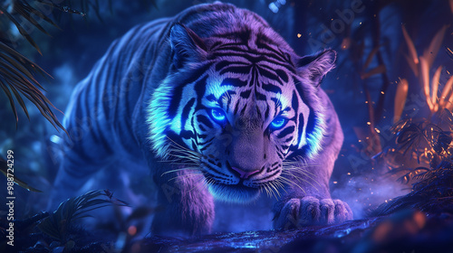 Glowing Blue and Purple Neon Tiger Stalking Through Cyberpunk Jungle