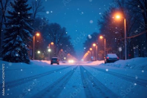 Glowing blue and white lights illuminate snowy ground, white lights, night scene
