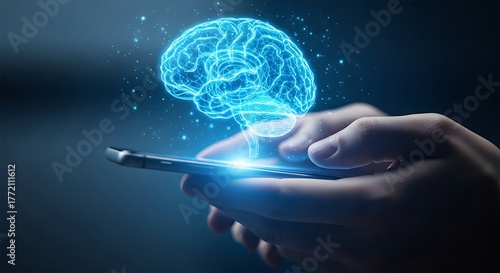 Glowing blue brain hologram over smartphone technology