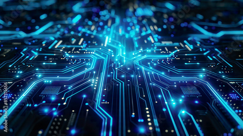Glowing blue circuit board abstract background with copy space in the center perfect for showcasing AI Technology and Cryptocurrencymodern design