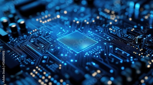 Glowing Blue Circuit Board, Close-Up of a Microchip's Intricate Design