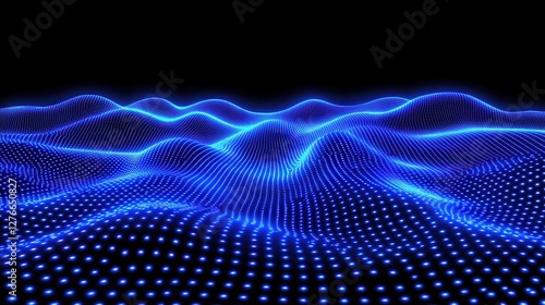 Glowing blue digital grid landscape with futuristic lights and wavy surface