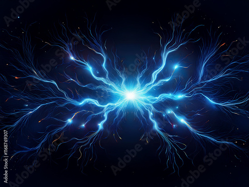 Glowing blue energy bursts from a central point, branching into intricate, luminous tendrils against a dark backdrop. The effect is otherworldly and mesmerizing.