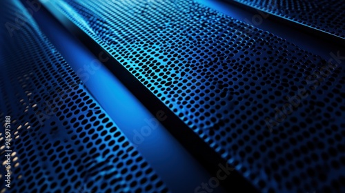 Glowing blue lines cutting across a dark blue steel mesh surface, with space for text or design elements. The metallic texture contrasts with the vibrant light.