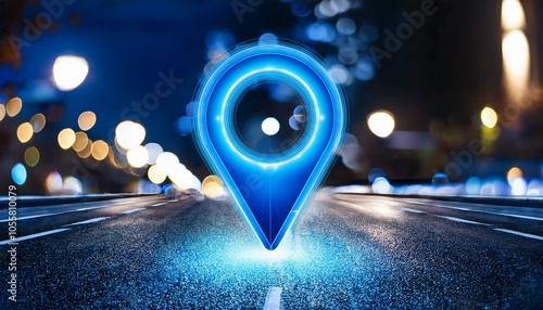 Glowing blue location pins on a dark and blurry street background at night.