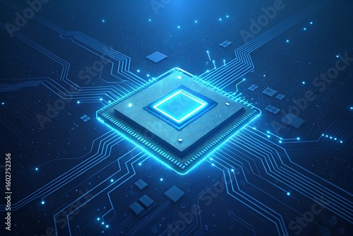 Glowing blue microchip processor with intricate circuitry and data flow