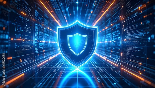 Glowing blue shield representing digital security, data protection, and cybersecurity concepts.