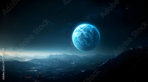 Glowing Blue Sphere Floating Above Dark Landscape With Digitized City Lights and Starry Sky