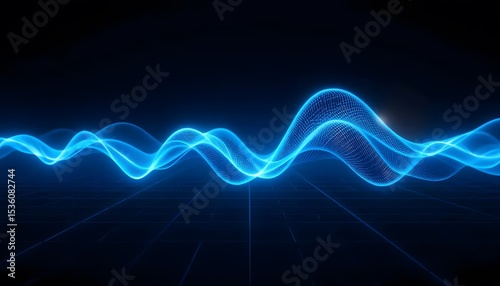 Glowing Blue Wireframe Waves on Dark Grid, Abstract Technology Background