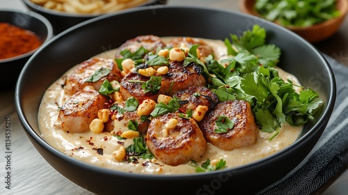 Glowing Bowl of Creamy and Aromatic Massaman Curry with Vibrant Herbs and Spices
