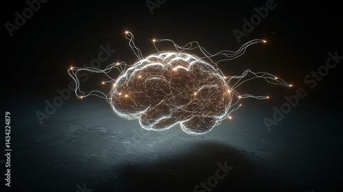 glowing brain floating in a dark space, with interconnected lines forming a network of thoughts. Some lines pulse with light, symbolizing active thinking, while others fade, representing forgotten