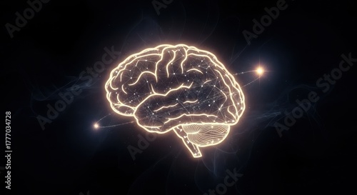Glowing brain illustration with neural network connections on a dark background representing intelligence and cognitive function of the human mind