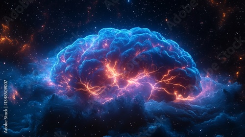 Glowing brain surrounded by cosmic clouds and stars in the dark