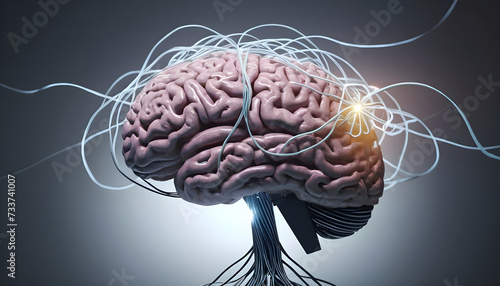 Glowing brain with rotating patterns representing artificial intelligence and data processing. Concept of intellectual capacity. Generative AI