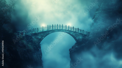 Glowing bridge spanning a misty chasm in an ethereal landscape at twilight
