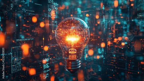 Glowing Bulb Amidst Digital Cityscape With Vibrant Lights And Abstract Circuitry Designs.