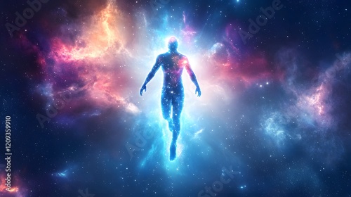 Glowing Celestial Being Flying Through Cosmic Space with Vibrant Colors and Starry Background