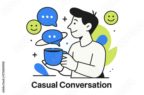 Glowing Coffee Chat. Small talk. Character holding glowing coffee cup with floating orbiting chat bubbles and
