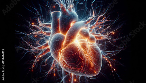 Glowing conceptual human heart 3d render, energy core, biotech and medical concept