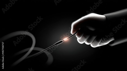 Glowing Connection: Hand Holding Futuristic Cable in Dark Background