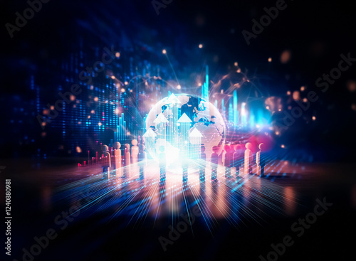 Glowing Earth encircled by a network of connections, surrounded by small figures representing global unity and interconnectedness. A symbolic representation of worldwide communication and collaborati