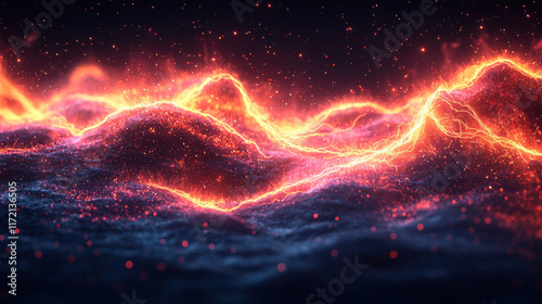 Glowing energy waves flow over dark, sparkling landscape with fiery background