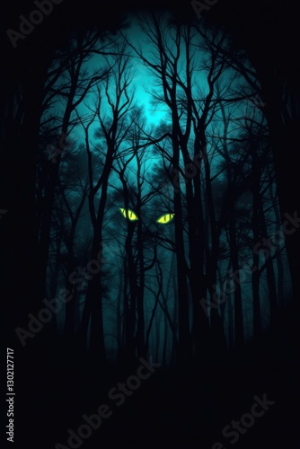 Glowing eyes pierce the darkness in a dense forest, creating an eerie and mysterious atmosphere.