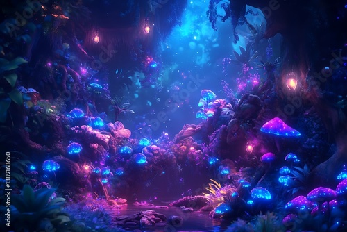 Glowing fantasy forest scene with vibrant lights, mystical mushrooms, and an ethereal river, perfect for illustrations