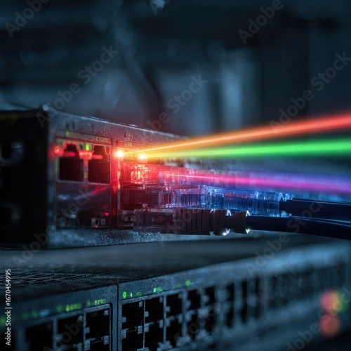 Glowing Fiber Optic Cable Transmits Data as Vibrant RGB Light Beams in a Server Rack.