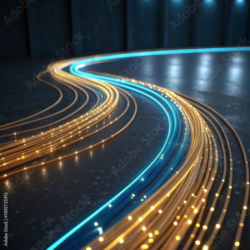 Glowing fiber optic cables transmit data across a dark surface. Ideal for tech, communication, and innovation themes.