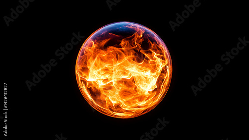 glowing fireball with vibrant flames and swirling patterns, set against black background, creates captivating visual