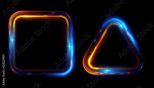 Glowing frames black background. Square glow borders. Sparkling geometric light banner. Luminous triangle light shape. Shining triangular forms. Neon sign. Bright sign with flares and sparkles. LED