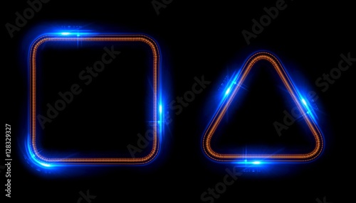 Glowing frames black background. Square glow borders. Sparkling geometric light banner. Luminous triangle light shape. Shining triangular forms. Neon sign. Bright sign with flares and sparkles. LED