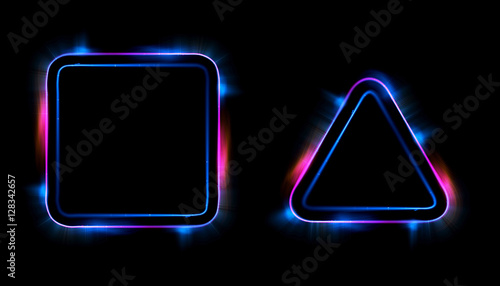 Glowing frames black background. Square glow borders. Sparkling geometric light banner. Luminous triangle light shape. Shining triangular forms. Neon sign. Bright sign with flares and sparkles. LED