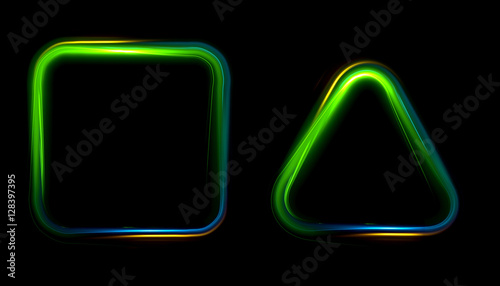 Glowing frames black background. Square glow borders. Sparkling geometric light banner. Luminous triangle light shape. Shining triangular forms. Neon sign. Bright sign with flares and sparkles. LED