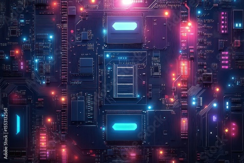 Glowing futuristic computer motherboard with bright neon lights and intricate circuitry in blue, pink, and orange tones