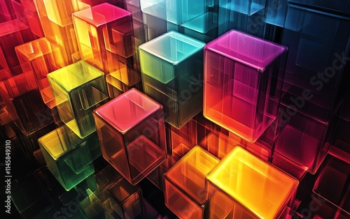 Glowing geometric shapes in colorful abstract digital art, representing futuristic technology and innovation in the digital age