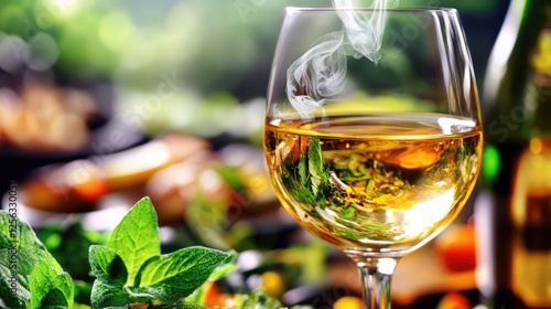 Glowing glass of white wine with fresh herbs and warm atmosphere outdoors