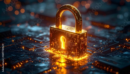 Glowing Golden Padlock on Dark Circuit Board, Generated with AI