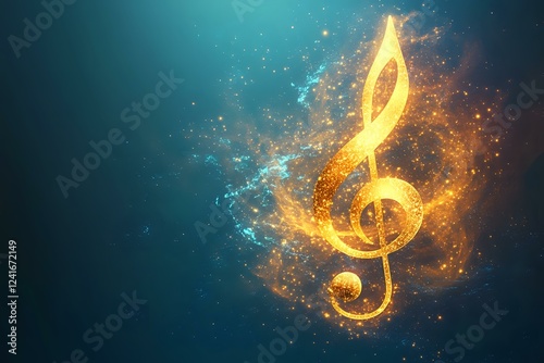 Glowing golden treble clef surrounded by magical fire particles and blue light effects on dark background, music concept for concert posters and album covers.
