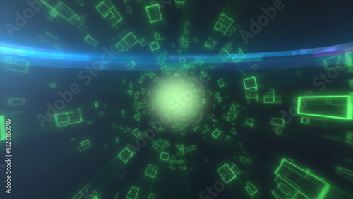Glowing green digital tunnel with floating geometric shapes forming a dynamic sci-fi data vortex