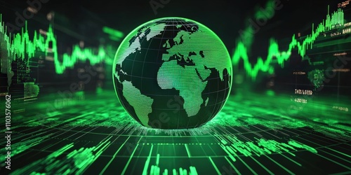 Glowing Green Globe with Data Visualization on a Dark Background Showing Digital Trends and Waves of Information. Global Stock market rally or recovery concept.stock, cryptocurrency background