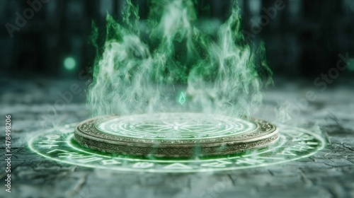 Glowing Green Mystic Runes And Ethereal Smoke On Metallic Platform