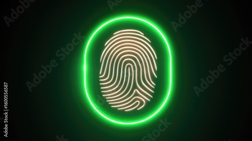 Glowing green neon circle illuminates fingerprint during biometric security scan. This futuristic concept represents digital identity authentication and secure data access technology